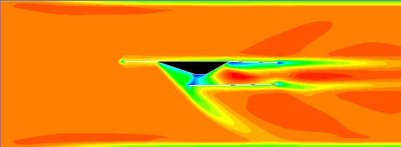 Here are some of the final results of my CAD class: some views of our F-14 inlet model, and a Mach number analysis from running a computation fluid dynamics simulation on a 2-D cross section. The inlet is about 20 feet long, and 3 feet wide and deep. The red for the Mach number display is slightly under Mach 3, and the blue is slightly under Mach 1.