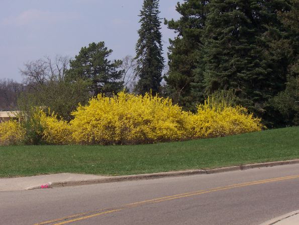 Sptring has really appeared here lately. A week ago things didn't really look too spring-like, except that the grass was slightly greener than it had been. But now a lot of flowers have grown up and bloomed, and the forsythias are all in bloom. The temperatures have been very pleasant. All that's left is leaves for the trees...