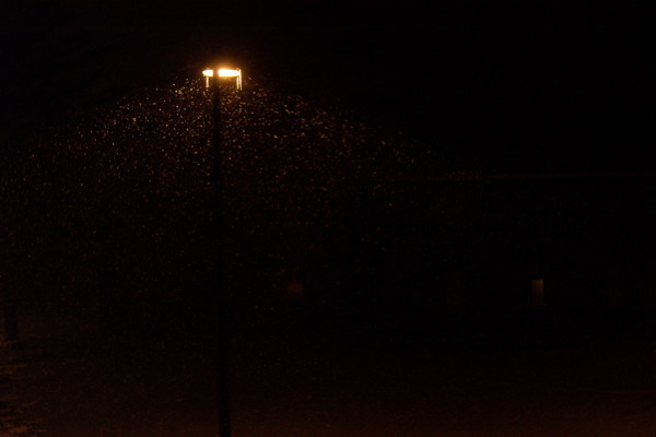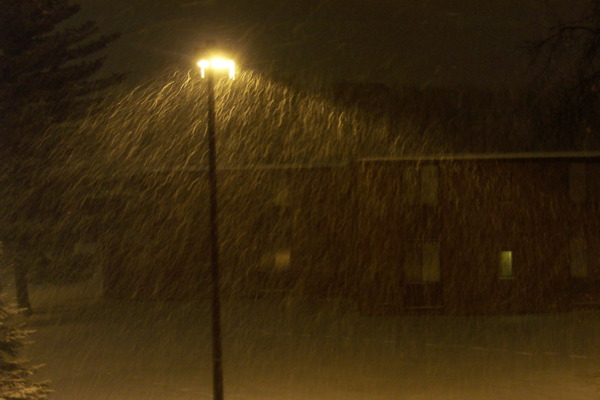 It has also been snowing alot here, recently. Here are a couple pictures I took. The first one was with a slow exposure. It more accurately depicts the lighting conditions. The second one was with a faster exposure, so it captures the individual snow flakes, not just a blur—but makes it look much darker than it really was.